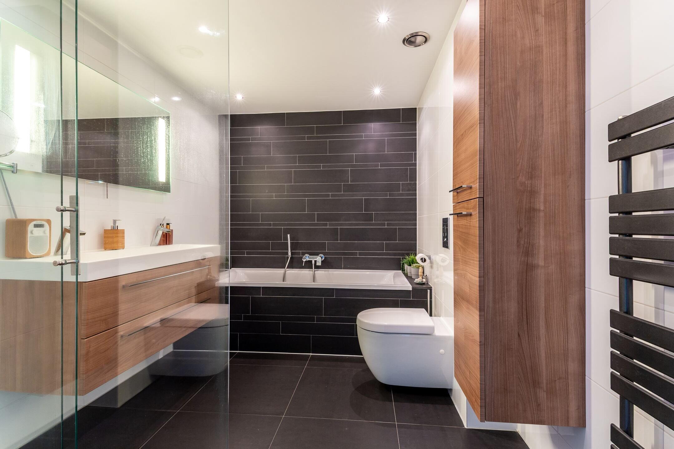 - Douche, dubbele wastafel, ligbad, en toilet